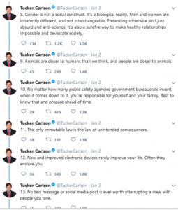 These screen caps are too small, but I suppose you can just search twitter for the thread (that's how I found it after seeing somebody quote it). Tucker Carlson (whose show I don't watch, but there are some hilariously edited clips online), gave 20 pieces of advice for the New Year. I found 5 to be obvious but easily forgotten. 7 is straight out of Epictetus (which means it's probably good advice). He's wrong about food. My mouth waters for steak and eggs. He's also right to emphasize personal responsibility for your emotional state and life in general.